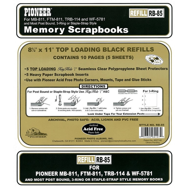 These specially patented refills also fit most 8½"x11" Scrapbooks: Post Bound, 3-Ring and Staple-Strap Style - including Pioneer MB-811, FMT-811, TRB-114 and WF-5781 albums.