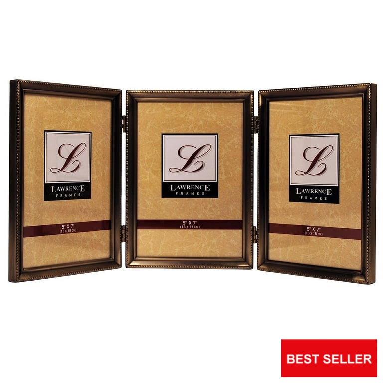 Main view Product Details Lawrence Frames® Classic antiqued gold-tone hinged triple for 5x7 prints — Antiqued goldtone frame is now available in a trio.Beautifully crafted with tightly joined seams and corners. Nicely backed for wonderful desk appeal. Glare resistant glass lenses. Edge measures 3/8" all around.By Lawrence®. Click the Lawrence Frame collection to shop the entire line. Classic antiqued gold-tone hinged triple for 5x7 prints Model #751148034982 List $52.00 You pay $44.95 In stock Ships next business day [?] Your Price Match is Active Your request for a price of $0.00 for a minimum quantity of has been accepted. You have [time] left to purchase this item for $0.00 instead of $44.95 each. Find a Lower Price? We BEAT All Authorized Retailers [?] FEATURESDisplays:5"x7"Material:Gold plateFinish:GoldOccasion:Anniversary, Birthday, Good luck, Graduation, Mother`s Day, Retirement, Romantic, Thank-Motivate-Reward, Celebrating Travels, WeddingStyle:Antique, Classic, Traditional, RomanticOrientation:Vertical OnlyBrand:Lawrence Frames®Display Type:Desktop or Wall This item ships in its own box SHARE THIS ITEM Share on Facebook