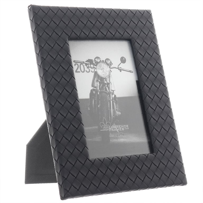 Main view Product Details Lawrence Frames® WOVEN Black bonded leather 4x6 frame — Beautifully crafted in black bonded woven-pattern leather.Glare resistant glass lens. Easel back for portrait or landscape tabletop display.By Lawrence Frames. WOVEN Black bonded leather 4x6 frame Model #48089340 List $23.00 You pay $17.95 In stock Can be shipped today [?] Your Price Match is Active Your request for a price of $0.00 for a minimum quantity of has been accepted. You have [time] left to purchase this item for $0.00 instead of $17.95 each. Find a Lower Price? We BEAT All Authorized Retailers [?] FEATURESDisplays:4"x6"Material:Leather (faux)Finish:BlackOccasion:Bar & Bat Mitzvah, Bon voyage, Business & office, Congratulations, Corporate gifts, Good luck, Grandparent`s Day, Home decorating, Housewarming, Teacher gifts, Team & coach gifts, Thank-Motivate-Reward, Celebrating TravelsStyle:ContemporaryOrientation:BothBrand:Lawrence Frames®Display Type:Desktop or Wall Approx. Overall Dimensions:6 5/8"x8 5/8"x3/4" This item ships in its own box SHARE THIS ITEM Share on Facebook