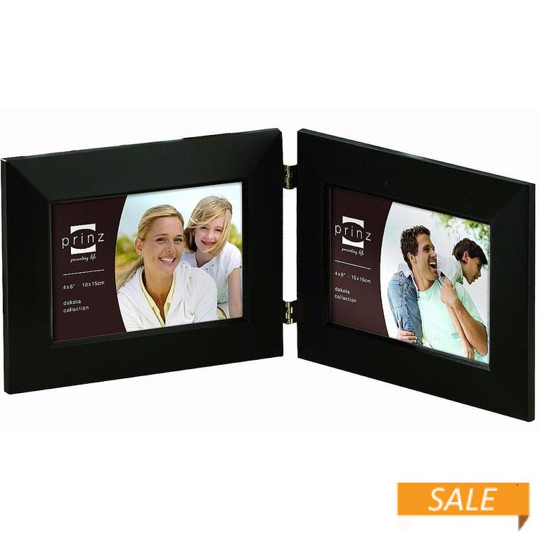 Product Details Prinz® frames & albums DAKOTA black beveled hinged landscape double — Our nicely crafted beveled duo is made of select hardwoods stained in a black furniture finish. Tailored corners and solid brass hinges make this a very nice picture frame to use for a photo story.Each frame has black hardboard backs with swivel tabs that easily open to insert prints. For tabletop display only.Glare resistant glass lenses.By Prinz®, maker of fine frames for generations. DAKOTA black beveled hinged landscape double Model #086981617857 List $24.00 You pay $16.90 In stock Ships next business day [?] Your Price Match is Active Your request for a price of $0.00 for a minimum quantity of has been accepted. You have [time] left to purchase this item for $0.00 instead of $16.90 each. Find a Lower Price? We BEAT All Authorized Retailers [?] FEATURESDisplays:4"x6"Material:Wood (full grain)Finish:BlackOccasion:Birthday, Business & office, Corporate gifts, Housewarming, Teacher gifts, Team & coach giftsStyle:Classic, Contemporary, TraditionalOrientation:Horizontal OnlyBrand:Prinz® frames & albumsDisplay Type:Desktop or Wall This item ships in its own box SHARE THIS ITEM Share on Facebook