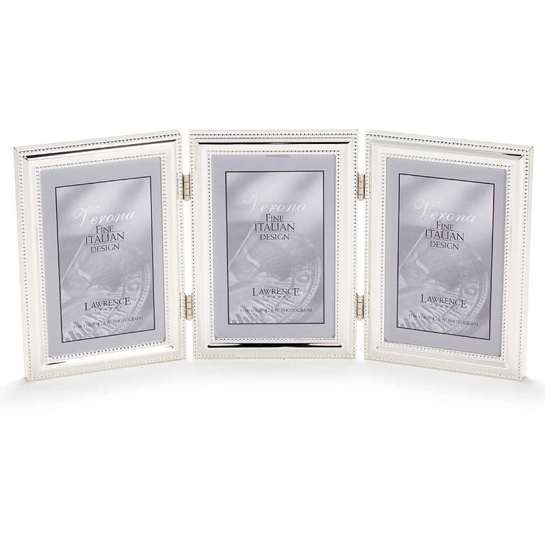 Main view Product Details Lawrence Frames® Polished silver hinged TRIPLE 4x6 w/double bead trim — Hard-to-find, this polished silverplate frame is a beautifully crafted desk piece with invisible seams and corners.Double 'caviar bead' trim border finishes the piece with excellent detail.Glare resistant glass lenses. Brass hinges for smooth closing. High quality navy blue velvet backing comes with hangers for wall mounting. By Lawrence Frames®, renowned for crafting fine frames for generations. Polished silver hinged TRIPLE 4x6 w/double bead trim Model #751148052696 List $56.00 You pay $45.95 In stock Ships next business day [?] Your Price Match is Active Your request for a price of $0.00 for a minimum quantity of has been accepted. You have [time] left to purchase this item for $0.00 instead of $45.95 each. Find a Lower Price? We BEAT All Authorized Retailers [?] FEATURESDisplays:4"x6"Material:SilverplateFinish:SilverOccasion:Anniversary, Birthday, Good luck, Graduation, Mother`s Day, Retirement, Romantic, Thank-Motivate-Reward, Celebrating Travels, WeddingStyle:Classic, Traditional, Romantic, GlamOrientation:Vertical OnlyBrand:Lawrence Frames®Display Type:Desktop or Wall This item ships in its own box SHARE THIS ITEM Share on Facebook