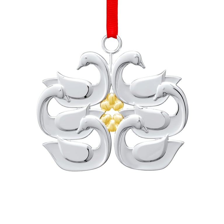 Main view Signature Gift Box Product Details Nambe Twelve Days of Christmas: Six-Geese-A-Laying Ornament by Nambe® — On the sixth day of Christmas, share a symbol of new life and creation. Part of the Twelve Days of Christmas Ornament series, the ornament depicts six silver geese with their eggs all in gold. Care & Use: Wipe clean with dry cloth Crafted by Nambe®. Twelve Days of Christmas: Six-Geese-A-Laying Ornament by Nambe® Model #672275009677 $35.95 This item IS in stock and can be expected to ship 02/18/2026 Your Price Match is Active Your request for a price of $0.00 for a minimum quantity of has been accepted. You have [time] left to purchase this item for $0.00 instead of $35.95 each. Find a Lower Price? We BEAT All Authorized Retailers [?] FEATURESMaterial:SilverplateFinish:Gold, SilverOccasion:ChristmasStyle:Sports & leisure, Words & whimsy, Sentiments | ready made, Preppy, ContemporaryBrand:NambeDisplay Type:not applicable n/a This item ships in its own box SHARE THIS ITEM Share on Facebook