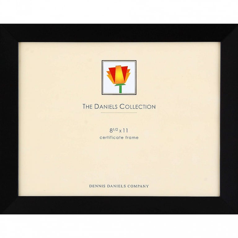Main view Product Details Dennis Daniels® Rich ebony-black bevelled wood classic 8.5x11 certificate size by Dennis Daniels® — For galleries and graduates, the Daniels' beautifully crafted certificate frame is simple and elegant. Inward bevel adds depth to the presentation and pulls the eye to the print.Crafted of solid hardwood, frame features tailored corners and finely fitting dual easel back for portrait or landscape tabletop display.Recessed wall mounting hooks included for easy hanging. Glare resistant glass lens. Moulding edge is 1" wide. Great for diplomas, certificates, and policy statements.Quality crafted by Dennis Daniels® of California, fine frames for generations. Rich ebony-black bevelled wood classic 8.5x11 certificate size by Dennis Daniels® Model #782680011292 List $26.50 You pay $22.95 In stock Can be shipped today [?] Your Price Match is Active Your request for a price of $0.00 for a minimum quantity of has been accepted. You have [time] left to purchase this item for $0.00 instead of $22.95 each. Find a Lower Price? We BEAT All Authorized Retailers [?] FEATURESDisplays:8.50"x11"Material:Wood (full grain)Finish:BlackOccasion:Business & office, Corporate gifts, Home decoratingStyle:Classic, Minimal, TraditionalOrientation:BothBrand:Dennis Daniels®Display Type:Desktop or Wall This item ships in its own box SHARE THIS ITEM Share on Facebook