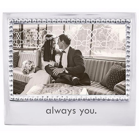 Main view Personalize Gifts for every occasion Create your own - see below to order Product Details Mariposa® The original ALWAYS YOU Statement frame crafted by Mariposa® — The "always you." Statement frame for a 6"x4" photo. People love the Mariposa casual, sculpted elegance — a strong, virtually carefree material. Their artisan handcrafted look in recycled aluminum is both pleasing to the eye and touch, as well as 100% ecologically sound. Shop the entire collection: Mariposa® Design Collection. Always shipped in a Mariposa beautiful signature box - makes gifting easy! Note: Mariposa frames are hand engraved. Actual may differ slightly from photo. The original ALWAYS YOU Statement frame crafted by Mariposa® Model #808813150529 $56.00 only 2 left, order soon. In stock Can be shipped today [?] Your Price Match is Active Your request for a price of $0.00 for a minimum quantity of has been accepted. You have [time] left to purchase this item for $0.00 instead of $56.00 each. Find a Lower Price? We BEAT All Authorized Retailers [?] FEATURESDisplays:4"x6"Material:AluminumFinish:SilverOccasion:Anniversary, Birthday, Engagement, Inspirational, Romantic, Valentine`s Day, WeddingStyle:Contemporary, Romantic, Santa Fe, Sophisticated, Words & whimsy, Eco-Friendly-Recycled, Modern (contemporary) wip, Sentiments | ready madeOrientation:Horizontal OnlyBrand:Mariposa®Display Type:Desktop Only Approx. Overall Dimensions:6 3/4"x5 3/4" This item ships in its own box SHARE THIS ITEM Share on Facebook