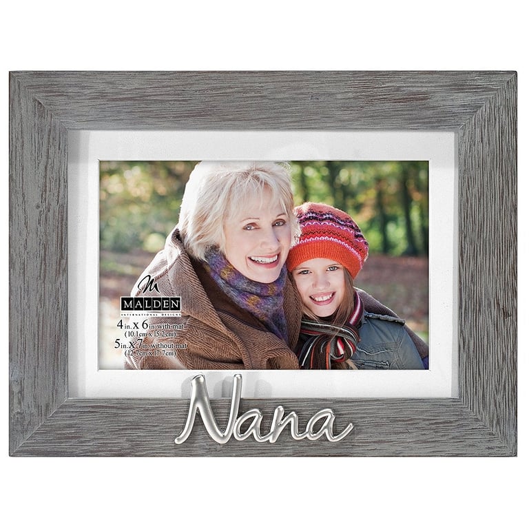 Main view Product Details Malden Designs® NANA distressed Gray keepsake 5x7/4x6 frame w/mat — For your special Nana, a frame all her own. Add a great photo and you have a gift that will make any Grandma beam with joy anytime she sees it ! Displays a 4"x6" print with its mat; a 5"x7" print without mat.Fashioned in distressed gray wood stain finish with pewter applique words. Glare resistant glass lens.Produced by Malden Design®. NANA distressed Gray keepsake 5x7/4x6 frame w/mat Malden Designs® HOLIDAY CELEBRATION Savings - ends SundayBuy More / Save More * Add this item to your cart for the full details of this promotion. Conditions may apply. Model #096287148719 List $17.50 You pay $12.95 This item is no longer available. This popular style was discontinued by the manufacturer as of 02/2025 For suggestions of replacements, see related product links (below) or email service@sendaframe.com. Your Price Match is Active Your request for a price of $0.00 for a minimum quantity of has been accepted. You have [time] left to purchase this item for $0.00 instead of $12.95 each. Find a Lower Price? We BEAT All Authorized Retailers [?] FEATURESDisplays:4"x6"Material:Wood (mdf/engineered)Finish:Gray/Charcoal, SilverOccasion:Grandparent`s Day, Mother`s DayStyle:Distressed - Weathered, Sports & leisure, Words & whimsy, Sentiments | ready madeOrientation:Horizontal OnlyBrand:Malden Designs®Display Type:Desktop or Wall Approx. Overall Dimensions:9"x7"x1" This item ships in its own box SHARE THIS ITEM Share on Facebook