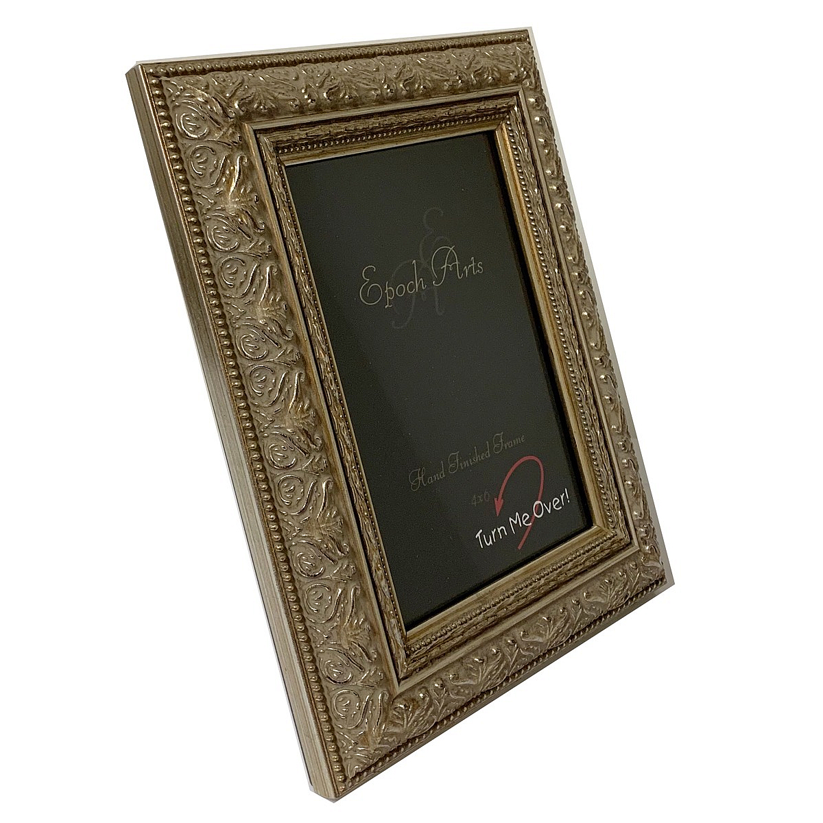 Main view Reverse (sample) Instructions Product Details Epoch Art™ Retro PAPILLON SILVER 4x6 by Epoch Arts® — PAPILLON SILVER is a fantastic reproduction of a turn-of-the-century (20th) frame. Beautifully treated hardwood, finished in a carved silver-leaf stain style.You will love the back of the piece. Patented back makes the frame adjustable between vertical and horizontal with, literally, a "snap". Expertly crafted by Epoch Arts®. PAPILLON SILVER 4x6 by Epoch Arts® Model #816558006025 $24.50 only 2 left, order soon. In stock Ships next business day [?] Your Price Match is Active Your request for a price of $0.00 for a minimum quantity of has been accepted. You have [time] left to purchase this item for $0.00 instead of $24.50 each. Find a Lower Price? We BEAT All Authorized Retailers [?] FEATURESDisplays:4"x6"Material:Wood (full grain)Finish:SilverOccasion:Home decoratingStyle:Antique, Rustic/Lodge, Traditional, Vintage Victorian, Ornate, SophisticatedOrientation:BothBrand:Epoch Art™ RetroDisplay Type:Desktop or Wall This item ships in its own box SHARE THIS ITEM Share on Facebook