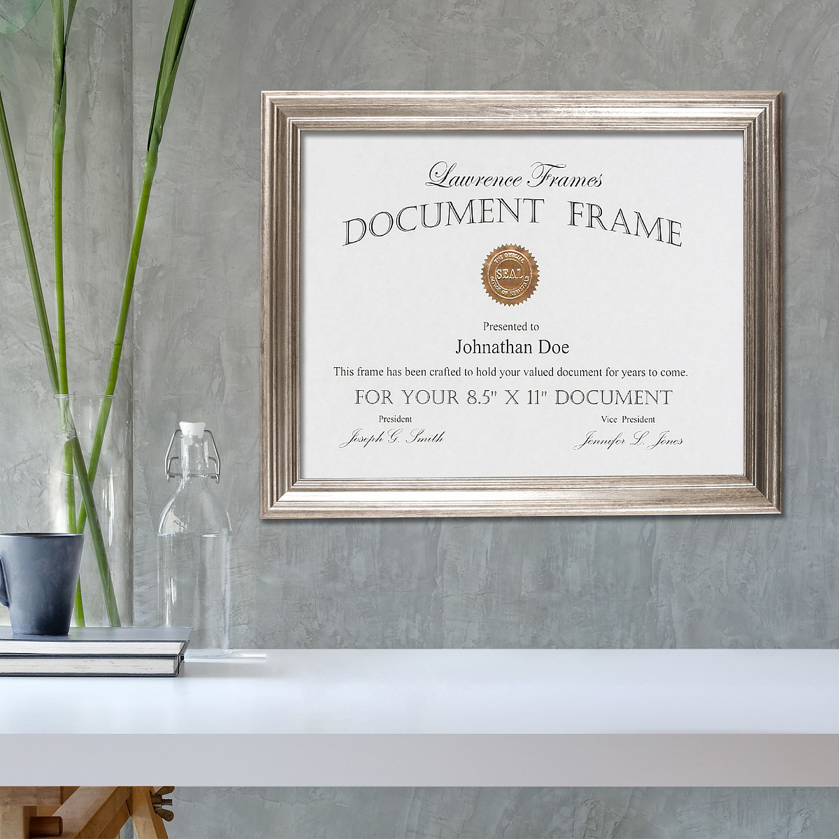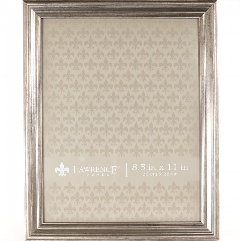 Main view Product Details Lawrence Frames® SUTTER Satin Silver composite wood 8.5x11 frame — High quality satin silver composite picture frame. Decorative picture frame Black velvet backing Vertical or horizontal easel for tabletop display Wall mounts for wall hanging Glare resistant glass lens Wipe clean with dry cloth By Lawrence Frames® SUTTER Satin Silver composite wood 8.5x11 frame Model #48083201 List $26.50 You pay $20.95 In stock Can be shipped today [?] Your Price Match is Active Your request for a price of $0.00 for a minimum quantity of has been accepted. You have [time] left to purchase this item for $0.00 instead of $20.95 each. Find a Lower Price? We BEAT All Authorized Retailers [?] FEATURESDisplays:8.50"x11"Material:Wood (mdf/engineered)Finish:Gray/Charcoal, SilverOccasion:Business & office, Congratulations, Corporate gifts, Graduation, Home decorating, Team & coach giftsStyle:Classic, TraditionalOrientation:BothBrand:Lawrence Frames®Display Type:Desktop or Wall This item ships in its own box SHARE THIS ITEM Share on Facebook
