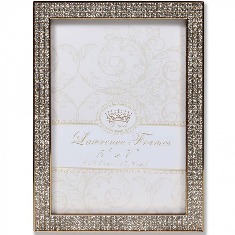 Main view Product Details Lawrence Frames® WHITE JEWELS GOLD/Crystal 5x7 frame — Nicely crafted, this bling designed frame is perfect for a fabulous glamour shot. 3 rows of square-cut crystals adorn the entire border of this fun gold-tone frame. Glare resistant glass lens. Black velvet easel back for tabletop display. Produced by Lawrence®. WHITE JEWELS GOLD/Crystal 5x7 frame Model #48073912 List $36.00 You pay $26.95 This item IS in stock and can be expected to ship 11/24/2025 Your Price Match is Active Your request for a price of $0.00 for a minimum quantity of has been accepted. You have [time] left to purchase this item for $0.00 instead of $26.95 each. Find a Lower Price? We BEAT All Authorized Retailers [?] FEATURESDisplays:5"x7"Material:Jewels/crystalFinish:Gold, ClearOccasion:Anniversary, Bar & Bat Mitzvah, Birthday, Engagement, Friendship, Get well, Good luck, Romantic, Sweet 16, WeddingStyle:Classic, Romantic, SophisticatedOrientation:BothBrand:Lawrence Frames®Display Type:Tabletop (or wall w/optional hanger - available separately) Approx. Overall Dimensions:5 3/4"x7 3/4"x11/16" This item ships in its own box SHARE THIS ITEM Share on Facebook