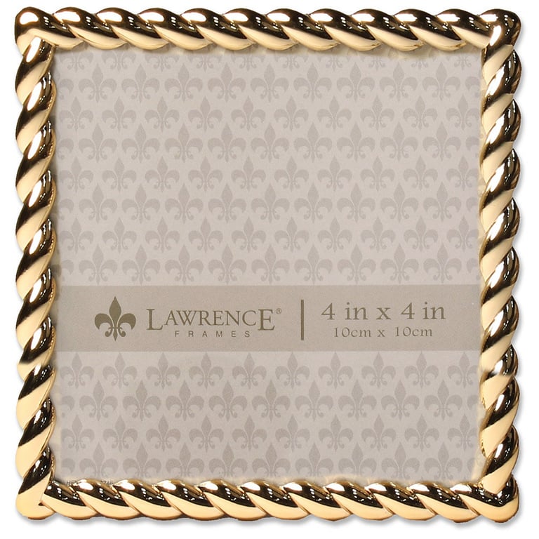 Product Details Lawrence Frames® GOLDEN ROPE 4x4 frame — ROPE border accent gives this style a glam look. Gold plated finish never needs care - just a wipe with damp cloth.Hardboard backed with easel for tabletop display. Walll mount for easy hanging. Glare resistant glass lens.Crafted by Lawrence®. GOLDEN ROPE 4x4 frame Model #48081559 List $24.00 You pay $20.95 This item IS in stock and can be expected to ship 11/19/2025 Your Price Match is Active Your request for a price of $0.00 for a minimum quantity of has been accepted. You have [time] left to purchase this item for $0.00 instead of $20.95 each. Find a Lower Price? We BEAT All Authorized Retailers [?] FEATURESDisplays:4"x4"Material:Metallic (all)Finish:GoldOccasion:Business & office, Employee honors, Good luck, Home decorating, Housewarming, Thank-Motivate-Reward, Celebrating Travels, BirthdayStyle:Classic, Contemporary, OrnateBrand:Lawrence Frames®Display Type:Desktop or Wall Approx. Overall Dimensions:4 5/8"x4 5/8"x11/16" This item ships in its own box SHARE THIS ITEM Share on Facebook
