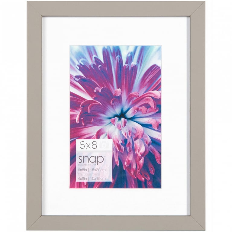 Product Details SNAP GREY LINEAR Frame w/White Mat 6x8/4x6 by SNAP™ — Show-off your print with this grey furniture-finished solid wood frame. Displays a 4"x6" print with its white mat; a 6"x8" without mat. Wall mounts are permanently" attached to the backing, out of sight. Easel back for tabletop display. Glare resistant glass lens. Crafted by SNAP™. GREY LINEAR Frame w/White Mat 6x8/4x6 by SNAP™ Model #038555503561 $8.95 only 3 left, order soon. In stock Ships next business day [?] Your Price Match is Active Your request for a price of $0.00 for a minimum quantity of has been accepted. You have [time] left to purchase this item for $0.00 instead of $8.95 each. Find a Lower Price? We BEAT All Authorized Retailers [?] This item ships in its own box SHARE THIS ITEM Share on Facebook